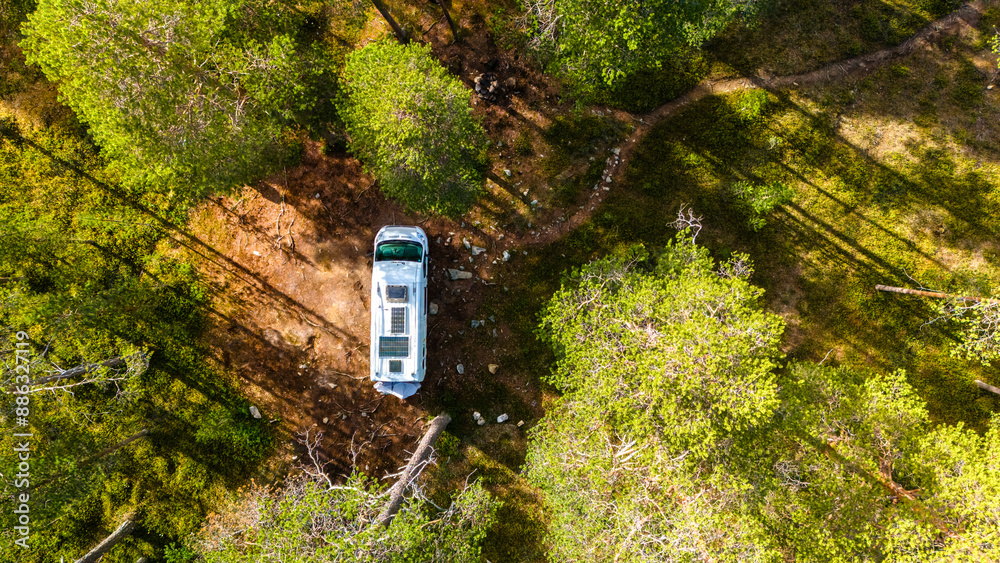 Samolepka An aerial view of a campervan parked in a clearing within a dense Finnish forest