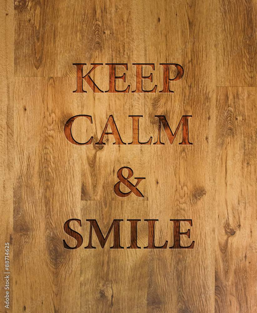 Samolepka Text Keep Calm & Smile engraved in wooden background