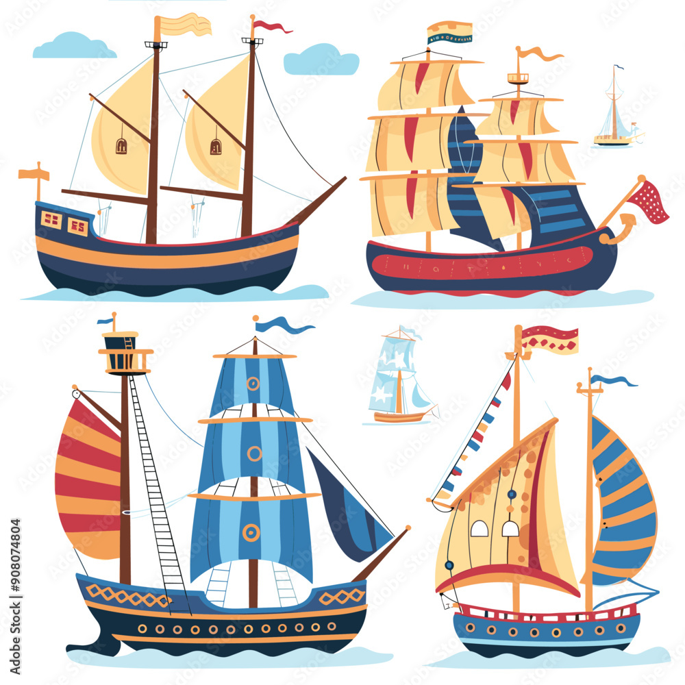 Samolepka Four vintage sailing ships display colorful sails flags, suggesting historical exploration
