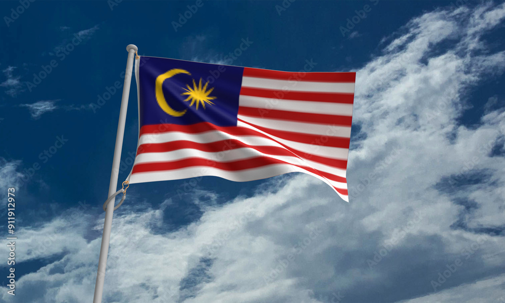 Samolepka malaysia country national flag waving blue sky cloud white landmark 31 thirty on