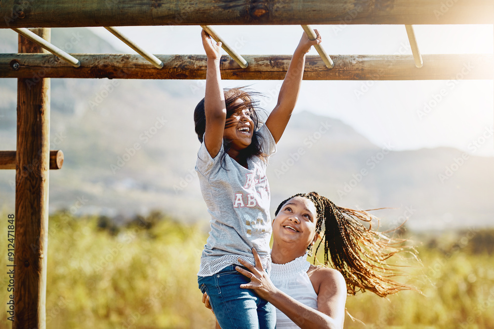 Samolepka Mother, happy child and play at jungle gym for support, energy or exercise with family at park