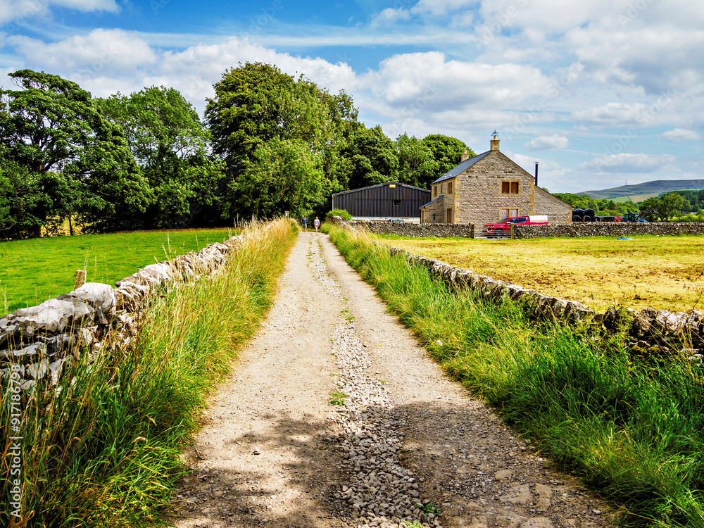 Samolepka Quaint stone farmhouse along a picturesque gravel road framed by lush greenery and pastures under a bright sky