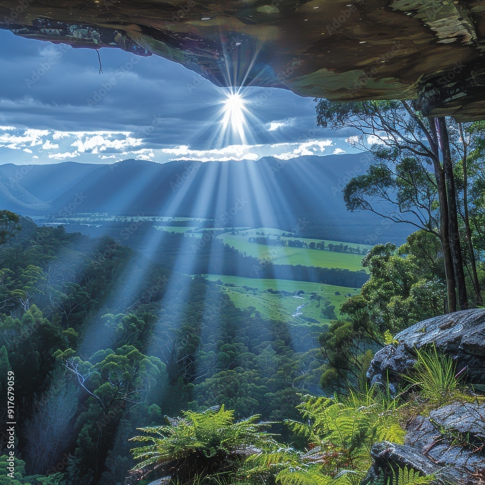 Obraz na plátně Stunning Sunrise Through Dense Forest Scene with Beams of Sunlight and Scenic Mo