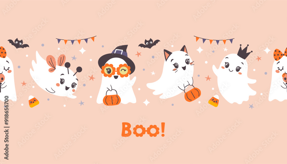 Samolepka Seamless Halloween border of cute little girl ghosts on pink background in flat cartoon style