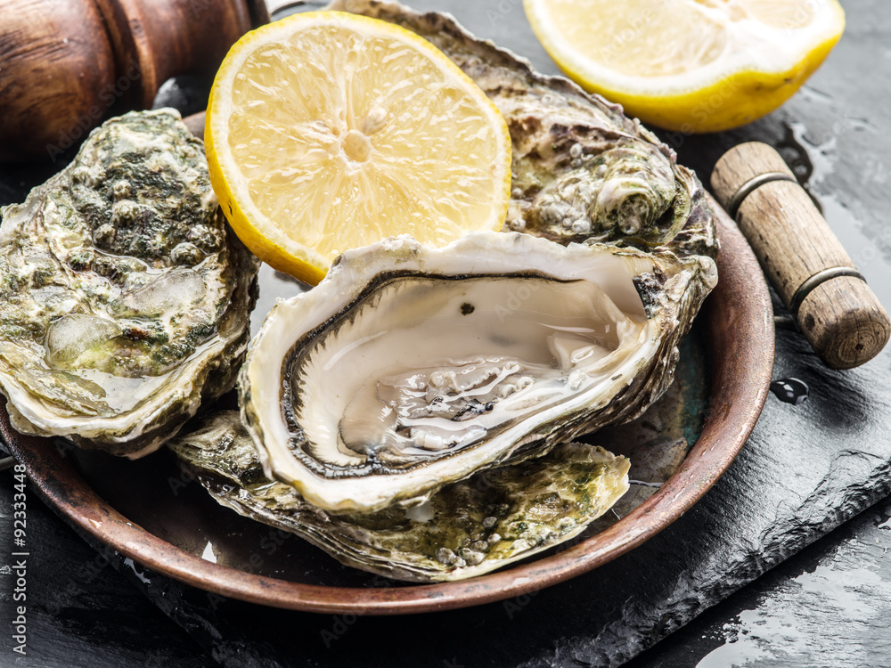 Raw oysters on the graphite board.