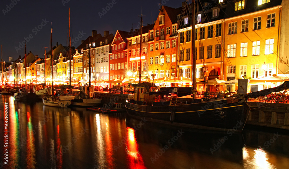 Samolepka Boats at the Nyhavn harbor in night, Copenhagen, Denmark