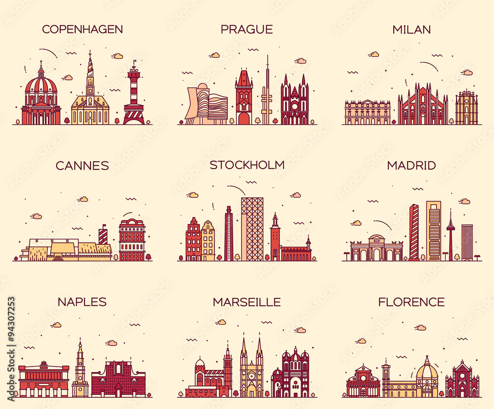 Samolepka Europe skylines Prague Cannes Madrid line art
