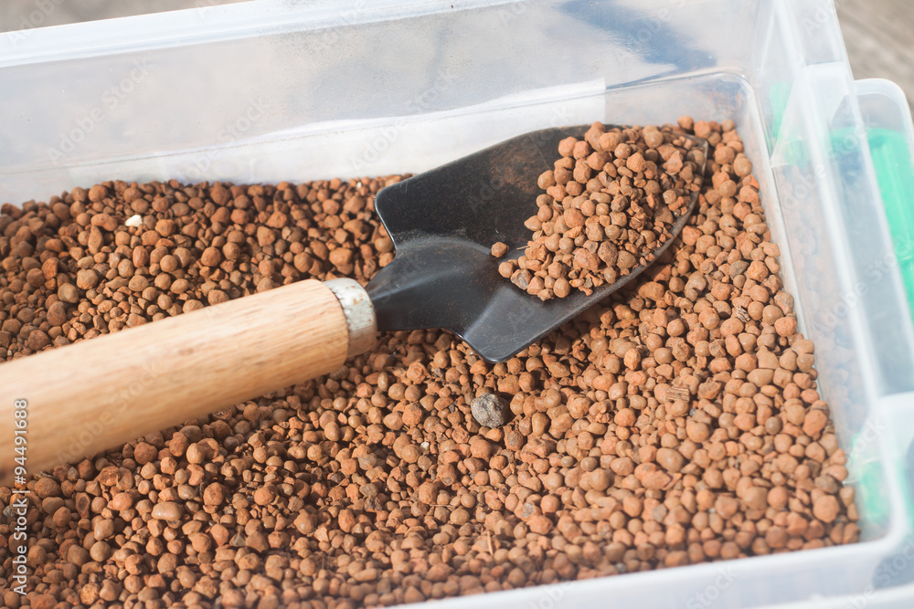 Samolepka pumice pebbles in bucket and gardening tool