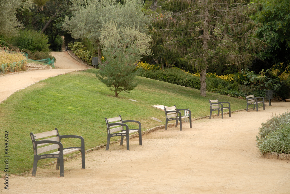 Samolepka Empty benches in Park Guell, Barcelona Spain