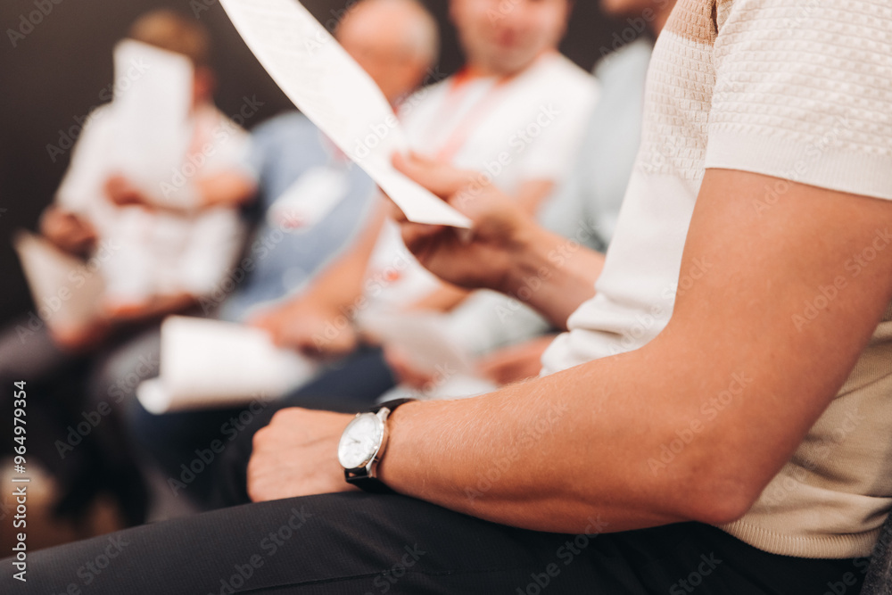 Samolepka Choir rehearsal, vocal class singing in the auditorium hall, group of students o