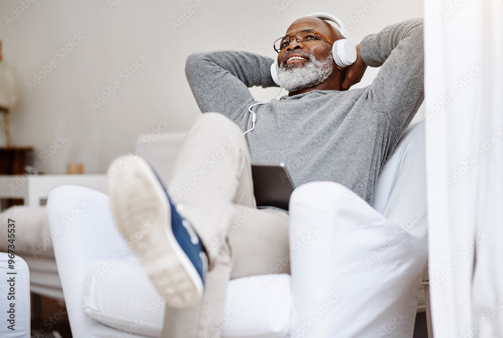 Samolepka Senior black man, relax and streaming music, podcast or jazz on radio in living room