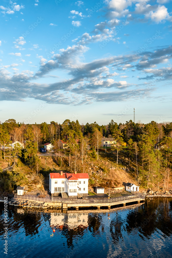 Samolepka Small idyllic port in the Swedish archipelago outside of Stockholm with beautiful reflection lighted with sunspot at autumn evening
