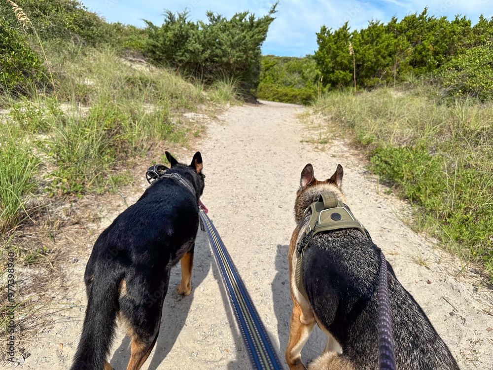 Samolepka Tow dogs walking on a hiking trail through green forest