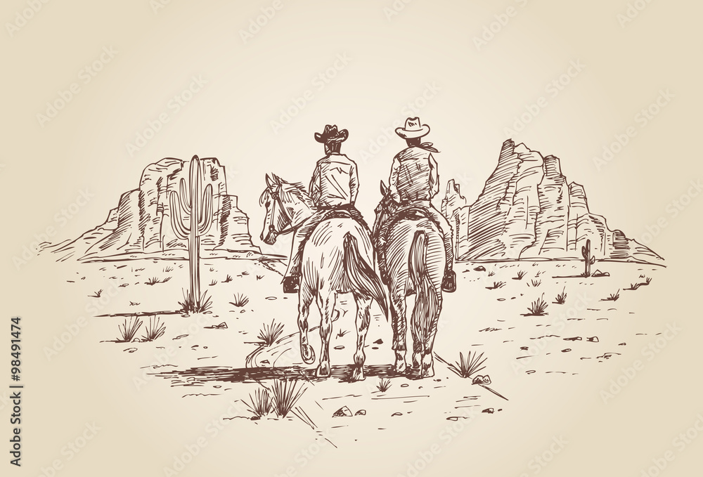 Samolepka Hand drawn of two cowboys riding horses in desert