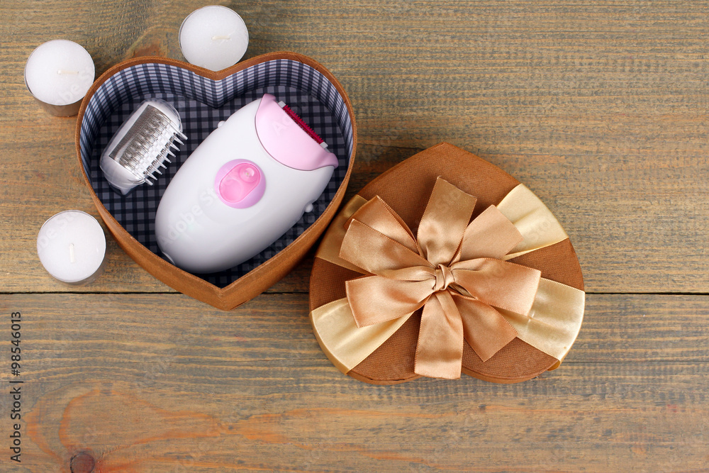 Samolepka epilator while lying down in a box for gift next to a candle on a wooden table
