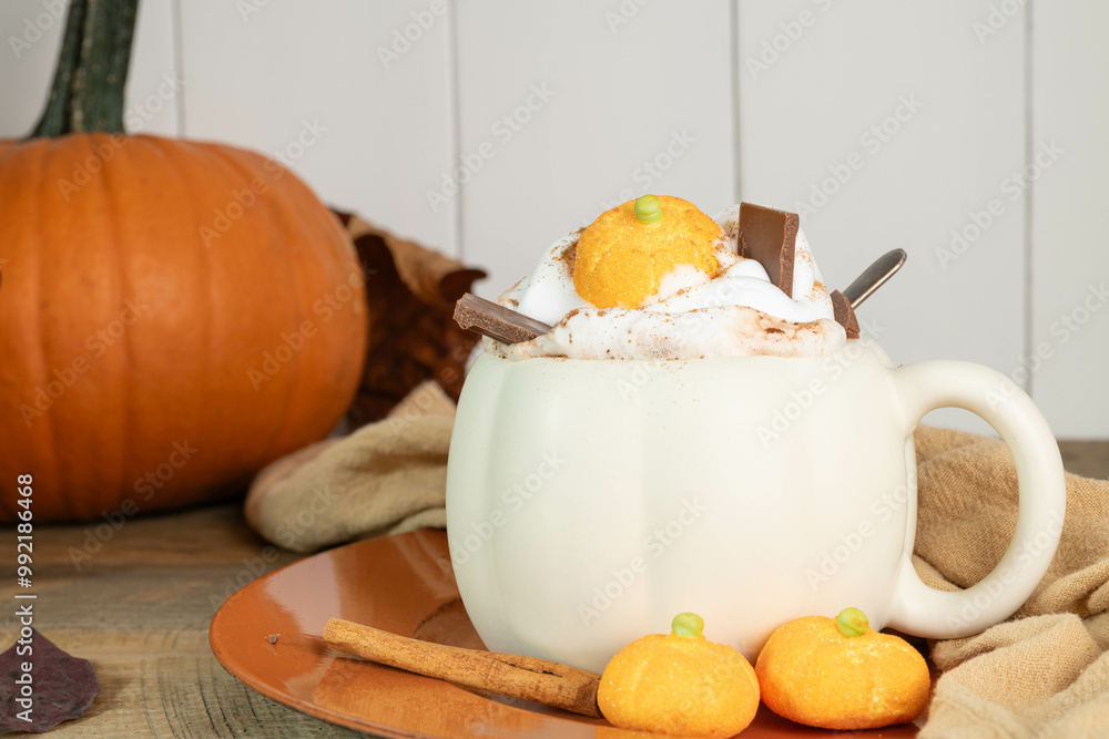 Samolepka Spiced hot chocolate or coffee latte in a pumpkin shaped mug on a wooden table