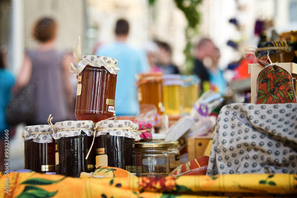 Samolepka Local homemade honey and jam pots on a provencal market, organic food, Provence,