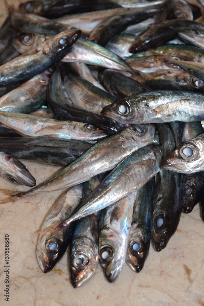 Fotografie Sardinen, Ein Berg frischer Sardinen auf dem Fischmarkt