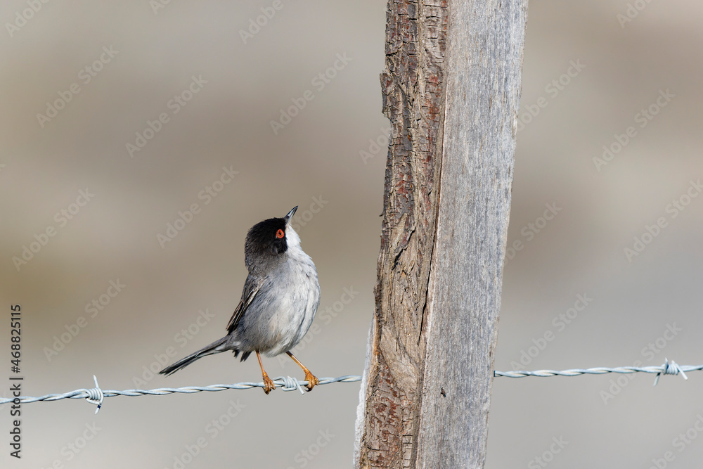 Fotografie Sardinian warbler curruca melanocephala perching on fence or twig