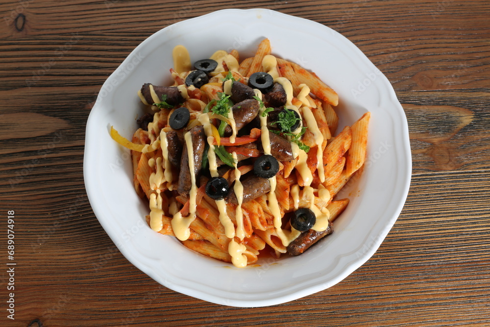 Fotografie Sausage pasta and cheese with black olive served in dish isolated on table top v