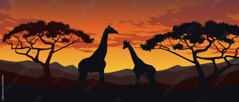 Fotografie Savannah Landscape Sunset Vector Illustration With Two Giraffe