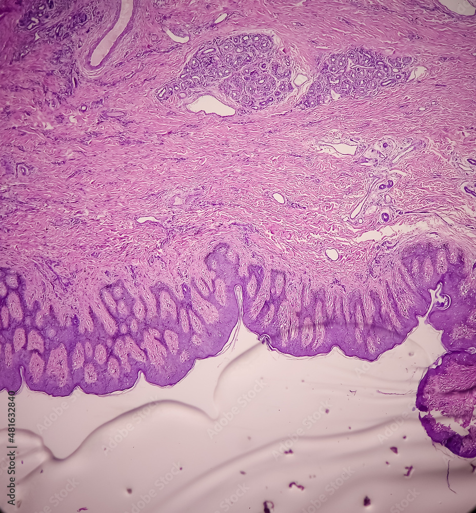 Obraz na plátně Scar endometriosis, microscopic image show fibrocollagenous tissue, ingrowth of endometrial glands and stroma, It is rare disease, 40x view
