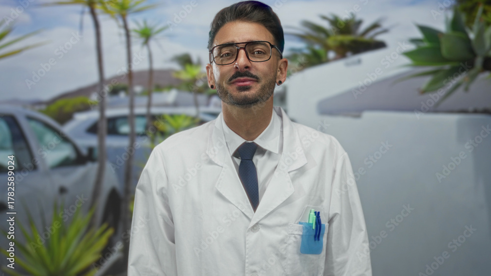 Fotografie Scientist shrugs palms up in white coat on sunlit urban street with parked cars in background; uncertainty