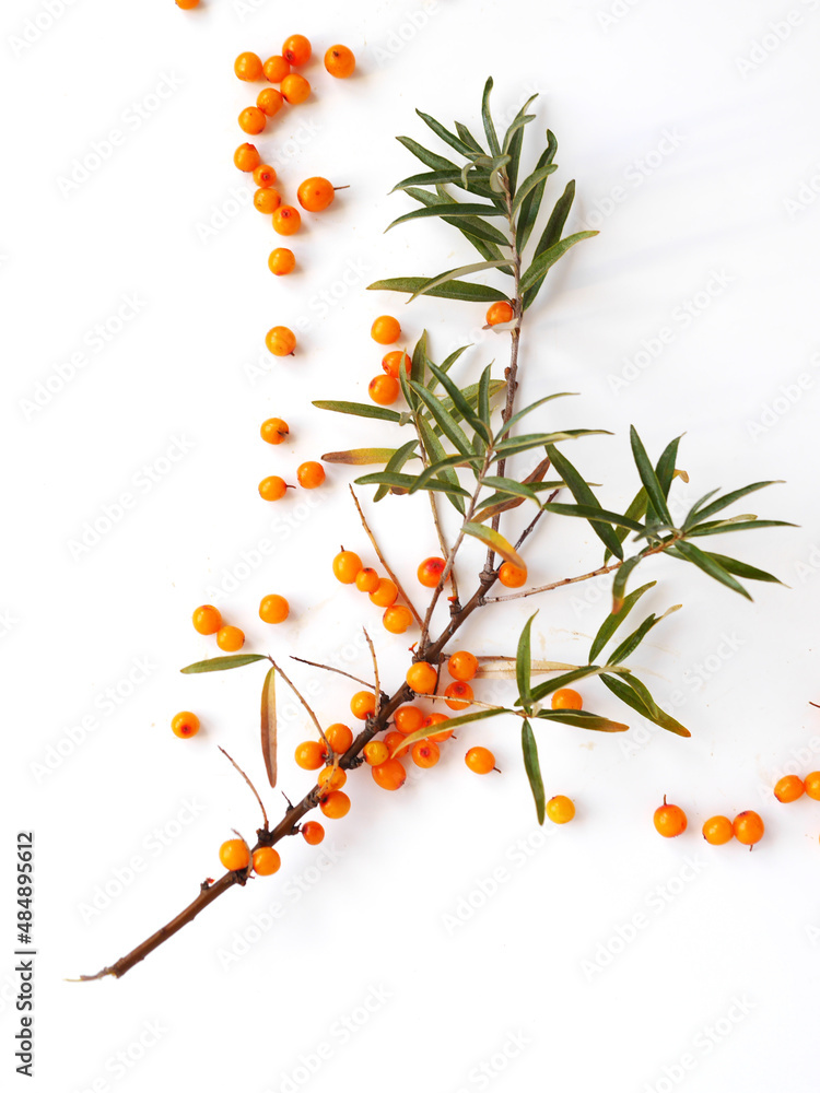 Obraz na plátně Sea buckthorn branch isolated on white background, top view