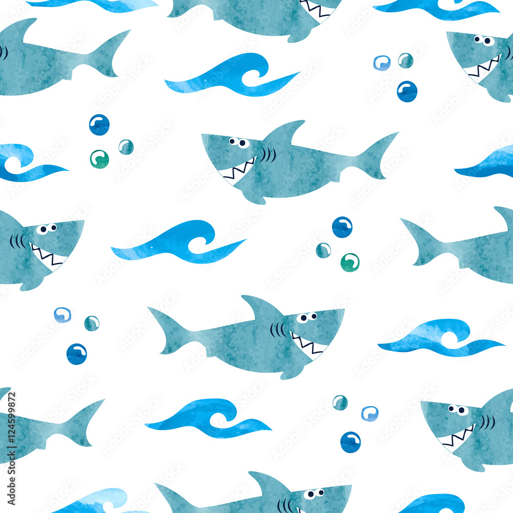 Fototapeta Seamless pattern with cartoon watercolor sharks