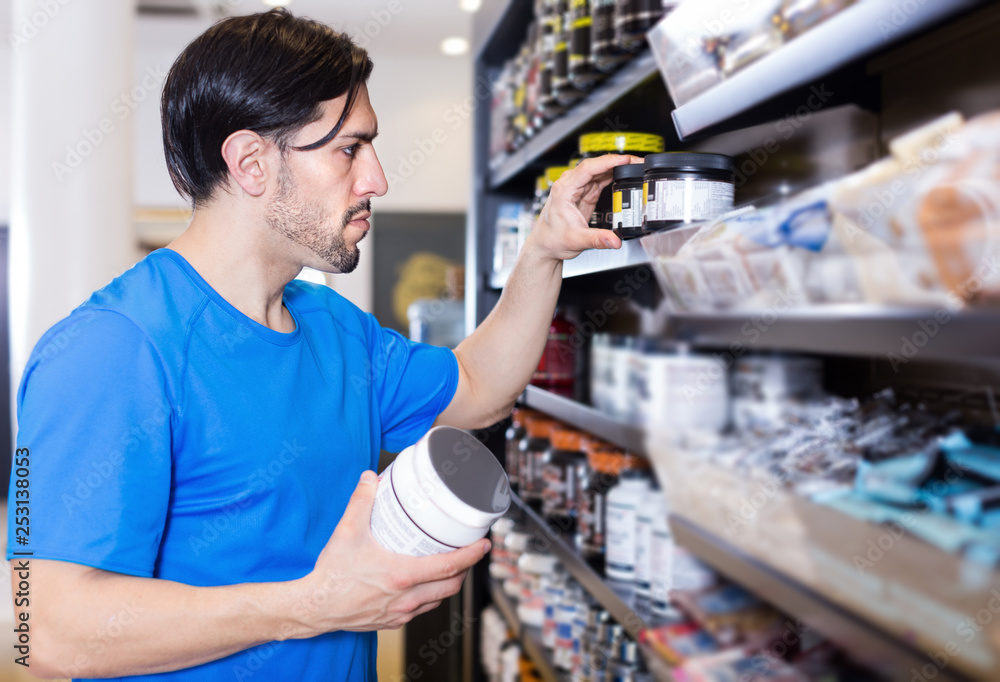 Fotografie Serious muscular sportman choosing sport dietary supplements