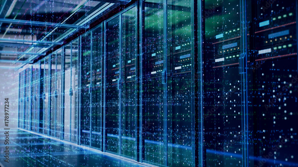 Obraz na plátně Server room or server computers with data hud.3d rendering.