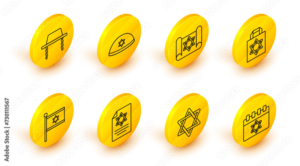 Fotografie Set line Jewish calendar, Star of David, Torah scroll, Flag Israel, Shopping bag with star david, kippah and Orthodox jewish hat icon
