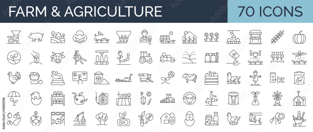 Fotografie Set of 70 line icons related to farm, farming, gardening, agriculture, smart farm, farm animals, seeding