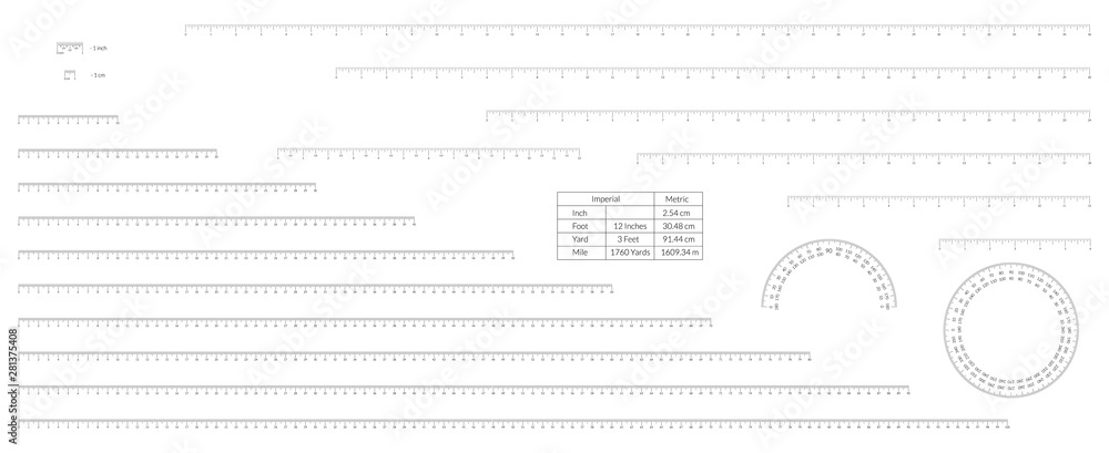 Fotografie Set of imperial and metric units measuring scale bars for ruler and protractor