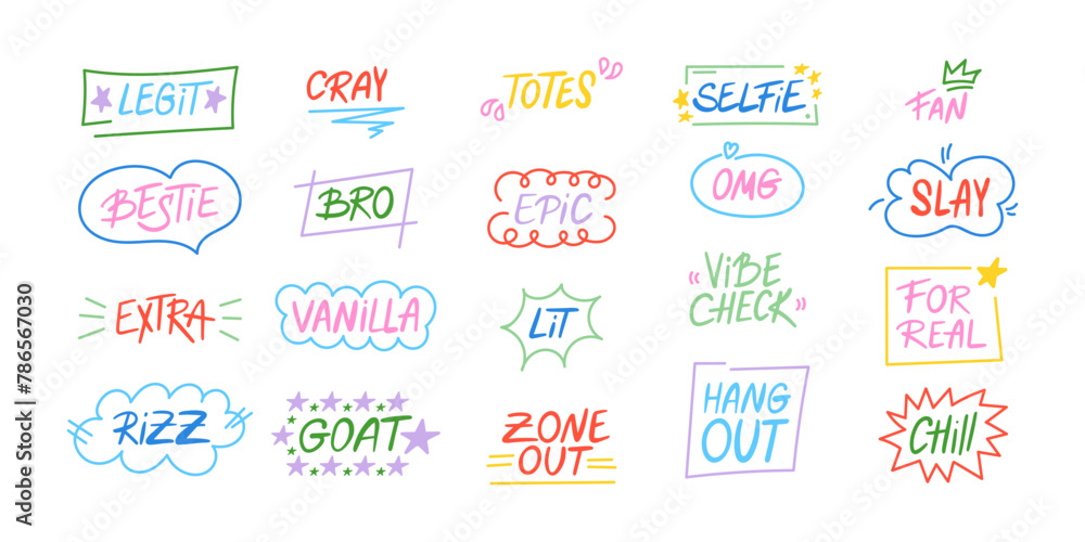 Fotografie Set of slang words, hand drawn lettering of modern short phrases