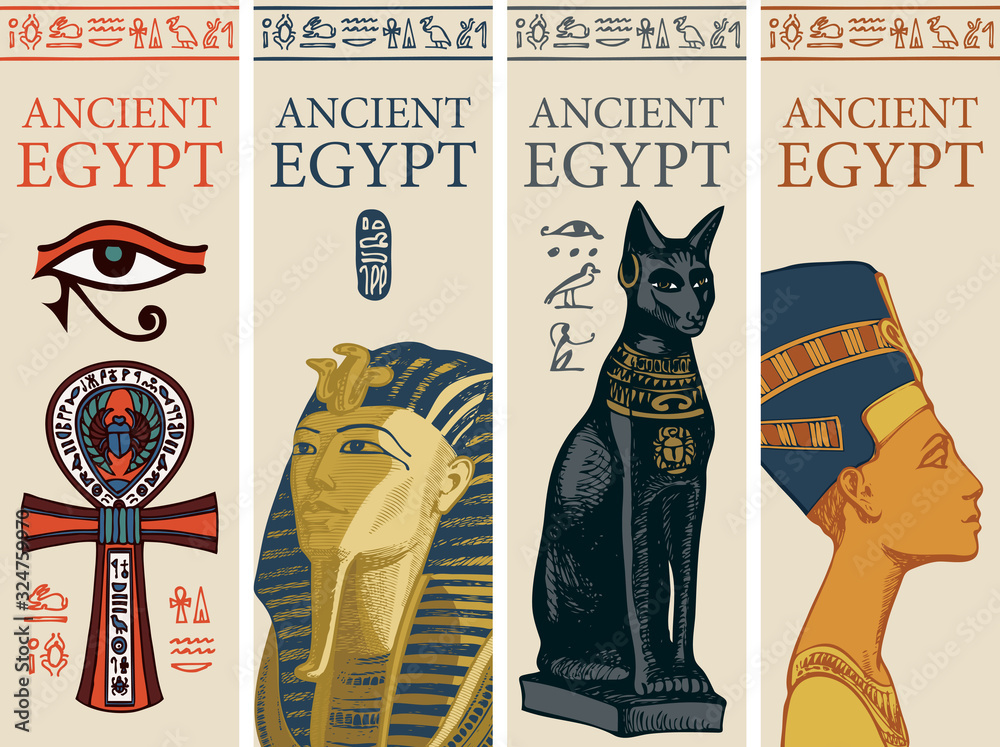 Obraz na plátně Set of vector travel posters with colored images of Coptic Cross, Tutankhamun, Bastet and Nefertiti