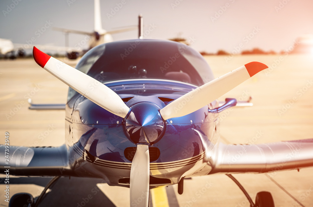 Fotografie Shiny blue sport plane at the airport sunshine runway