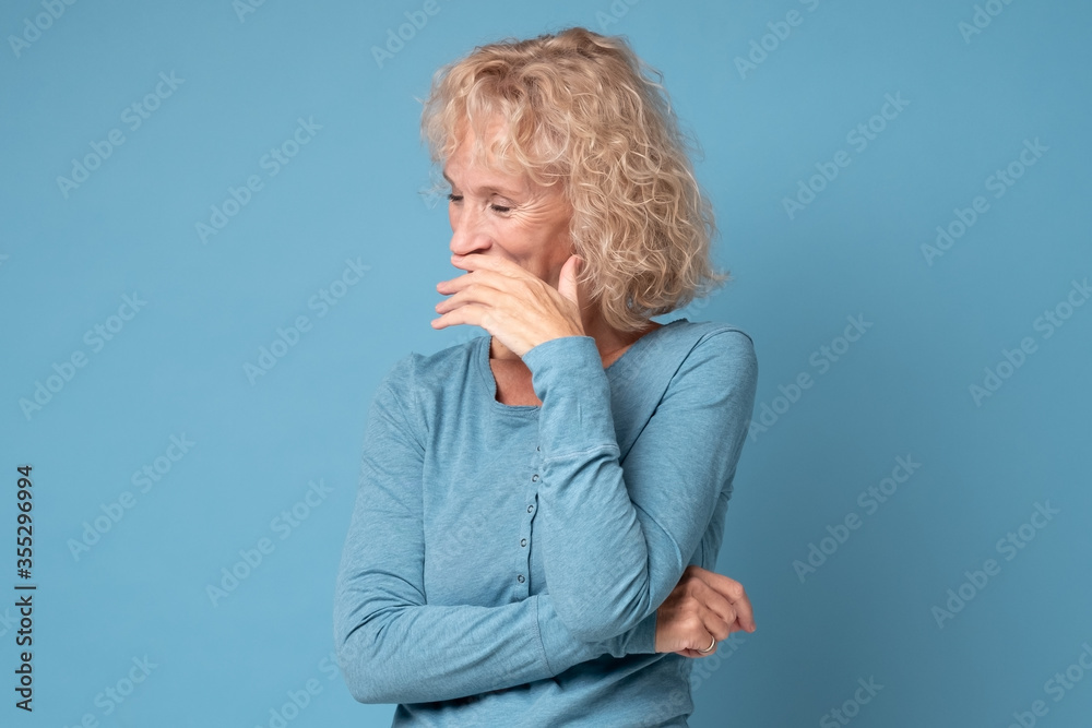 Obraz na plátně shy caucasian mature woman smiling with hand on her mouth