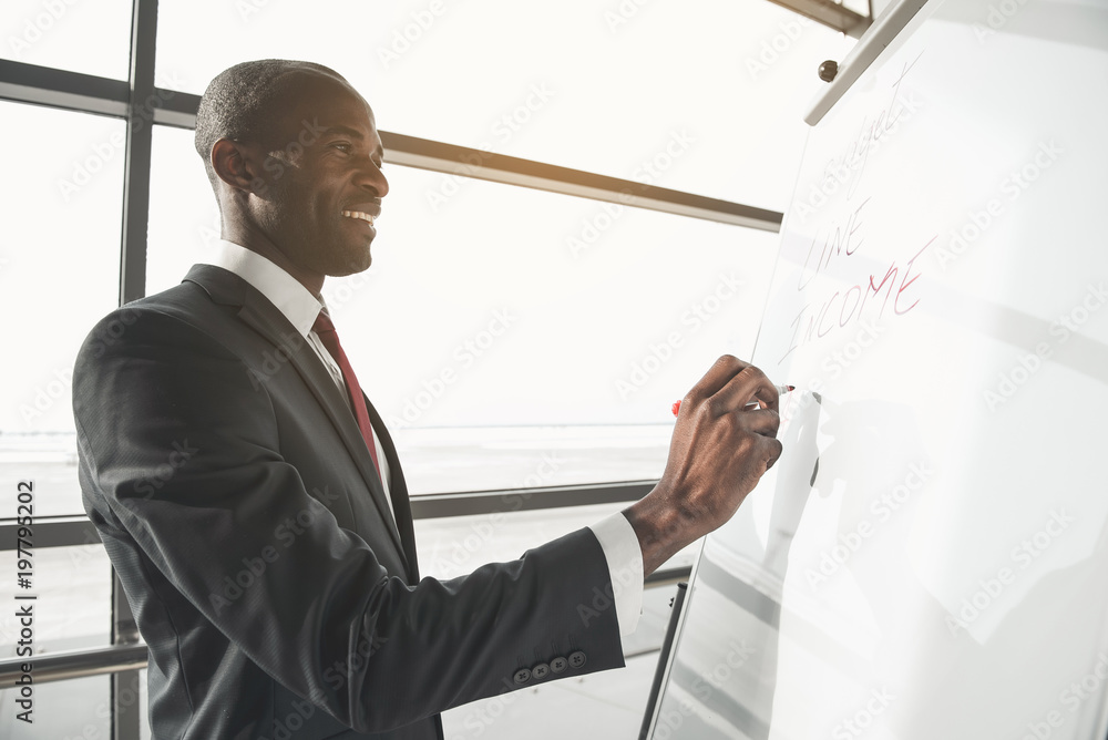 Fotografie Side view profile of smiling african worker standing at large window and writing