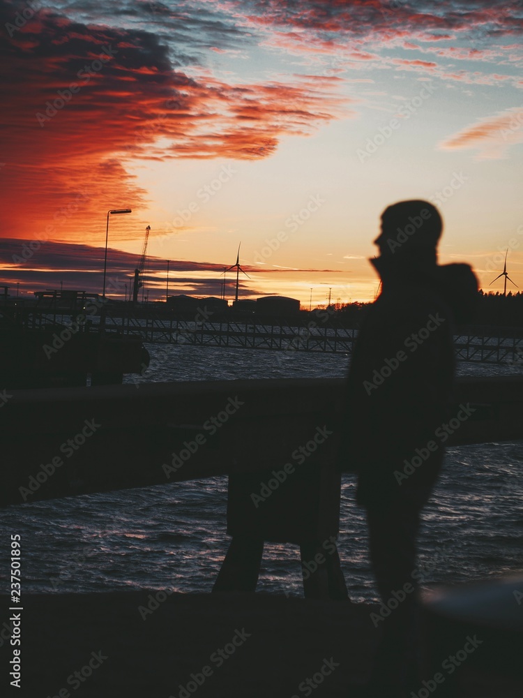 Fotografie Silhouette of a man with a hat in the winter at sunset near the sea on the pier