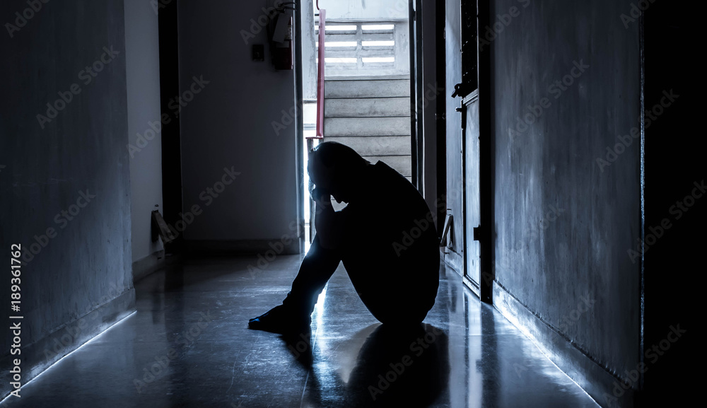 Fotografie Silhouette of a sad young man sitting in the dark leaning against the wall with his back, The sun is in sorrow