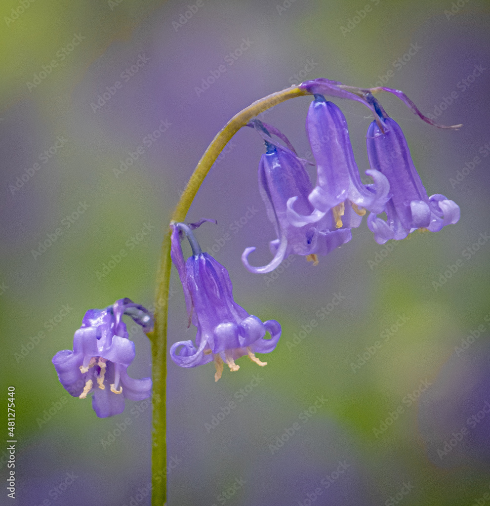 Fotografie Single bluebell stem against blurred bluebell woods