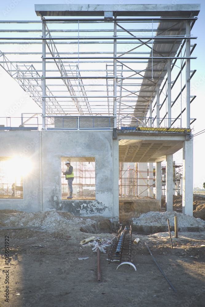 Obraz na plátně Site manager checking window frame on construction site