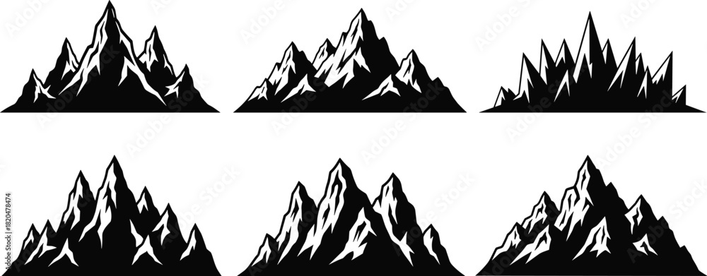 Fotografie Six black and white mountain range silhouettes with sharp peaks and jagged edges