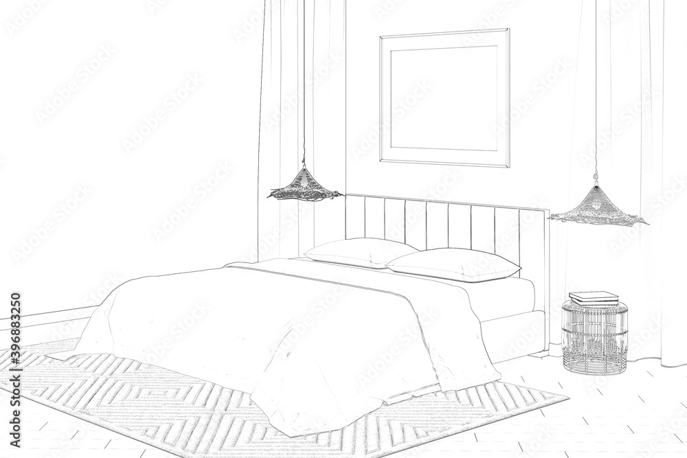 Fotografie Sketch of a bedroom with a horizontal poster on the wall between two windows, a bed with wicker chandeliers over bamboo bedside tables, and a carpet on the parquet floor
