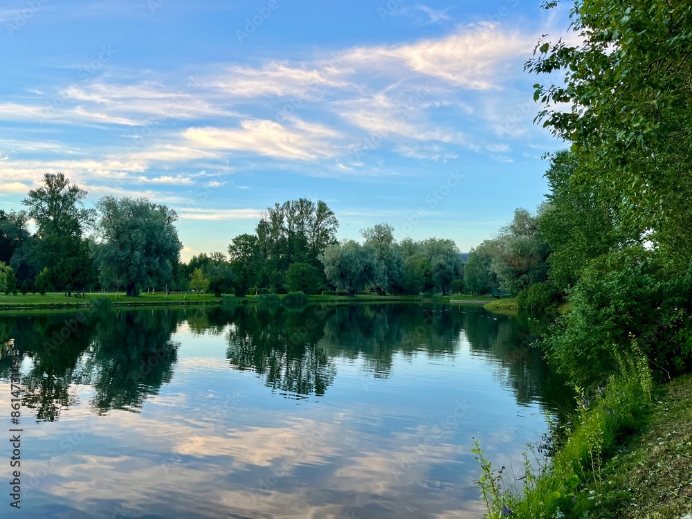 Fotografie Sky and trees reflection on the calm surface of the lake, summer lake in the par