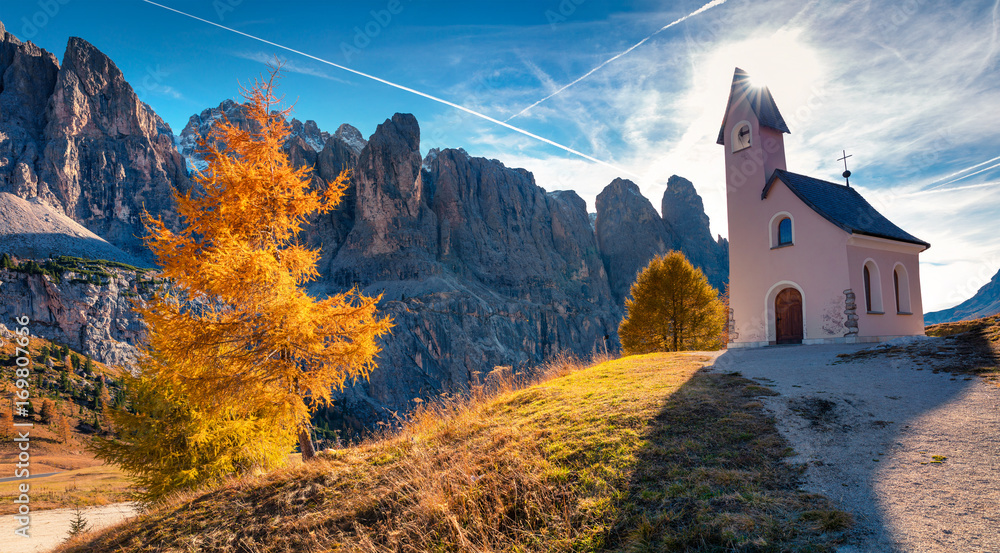 Fotografie Small church on the top of Gardena pass with Piz Boe mountain on background