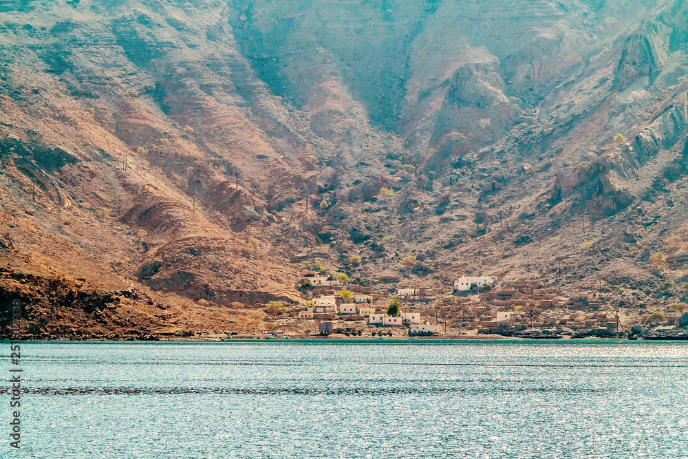 Fotografie Small settlement at the foot of the cliffs on the coast of the Gulf of Oman