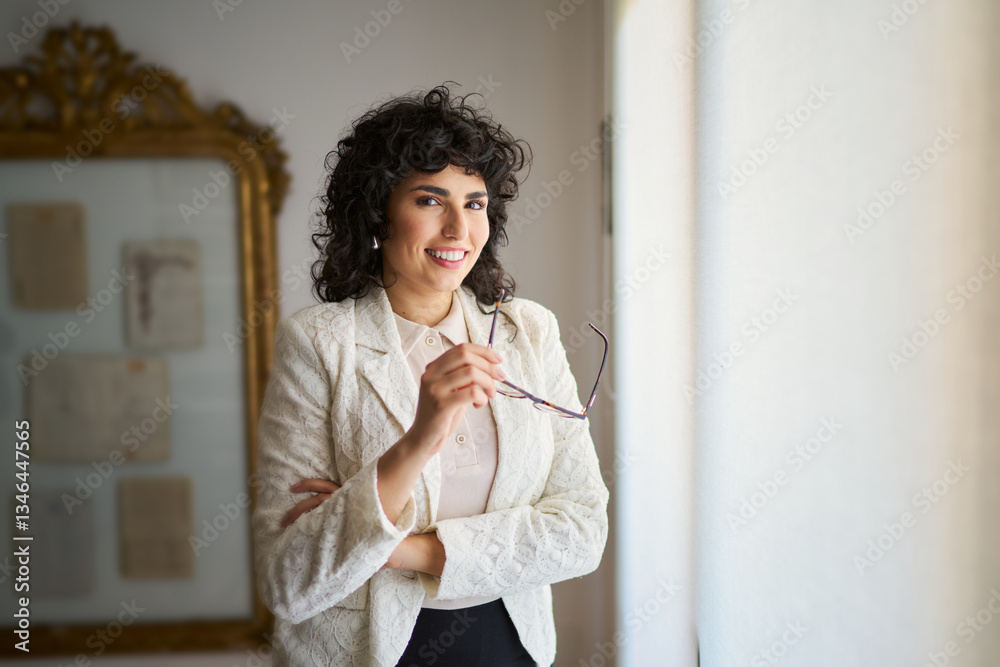 Fotografie Smiling art curator holding eyeglasses and looking out window in museum