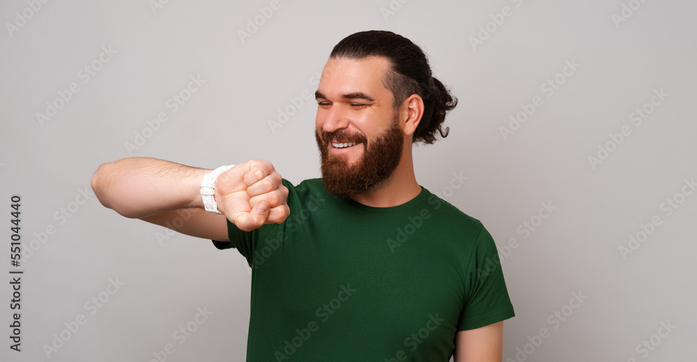 Fotografie Smiling bearded man is checking the wrist watch to find out what time is it